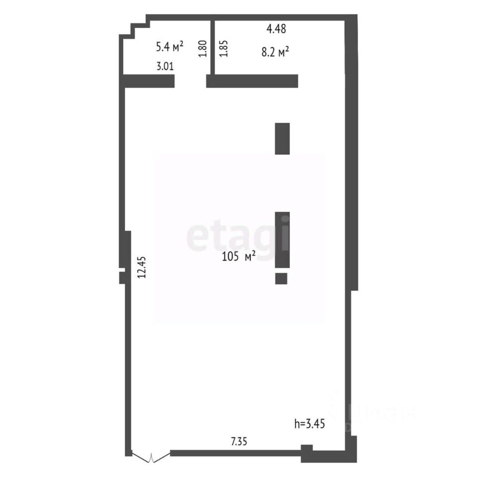 Общая площадь: 104 м², 1 этаж, высота потолков 3.5 м.