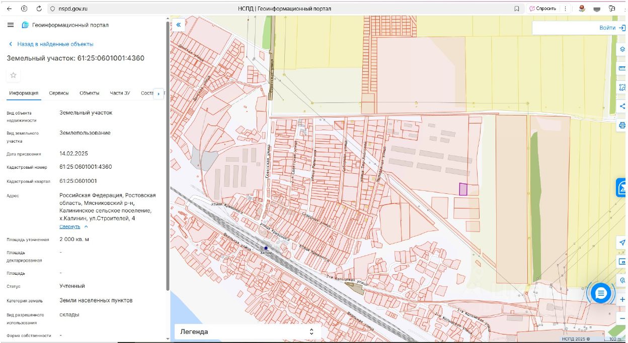 Земельный участок, государственная собственность на который не разграничена, из земель населенных пунктов, с кадастровым номером 61:25:0601001:4360, расположенный по адресу: Российская Федерация, Ростовская область, Мясниковский р-н, Калининское сельское поселение, х. Калинин, ул. Строителей, 4, общей площадью 2000 кв.м.