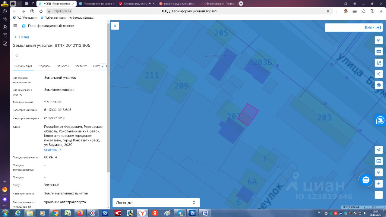 Земельный участок с кадастровым номером 61:17:0010113:605 площадь 60 по адресу Российская Федерация, Ростовская область, Константиновский район, Константиновское городское поселение, город Константиновск, ул Баумана, 203С