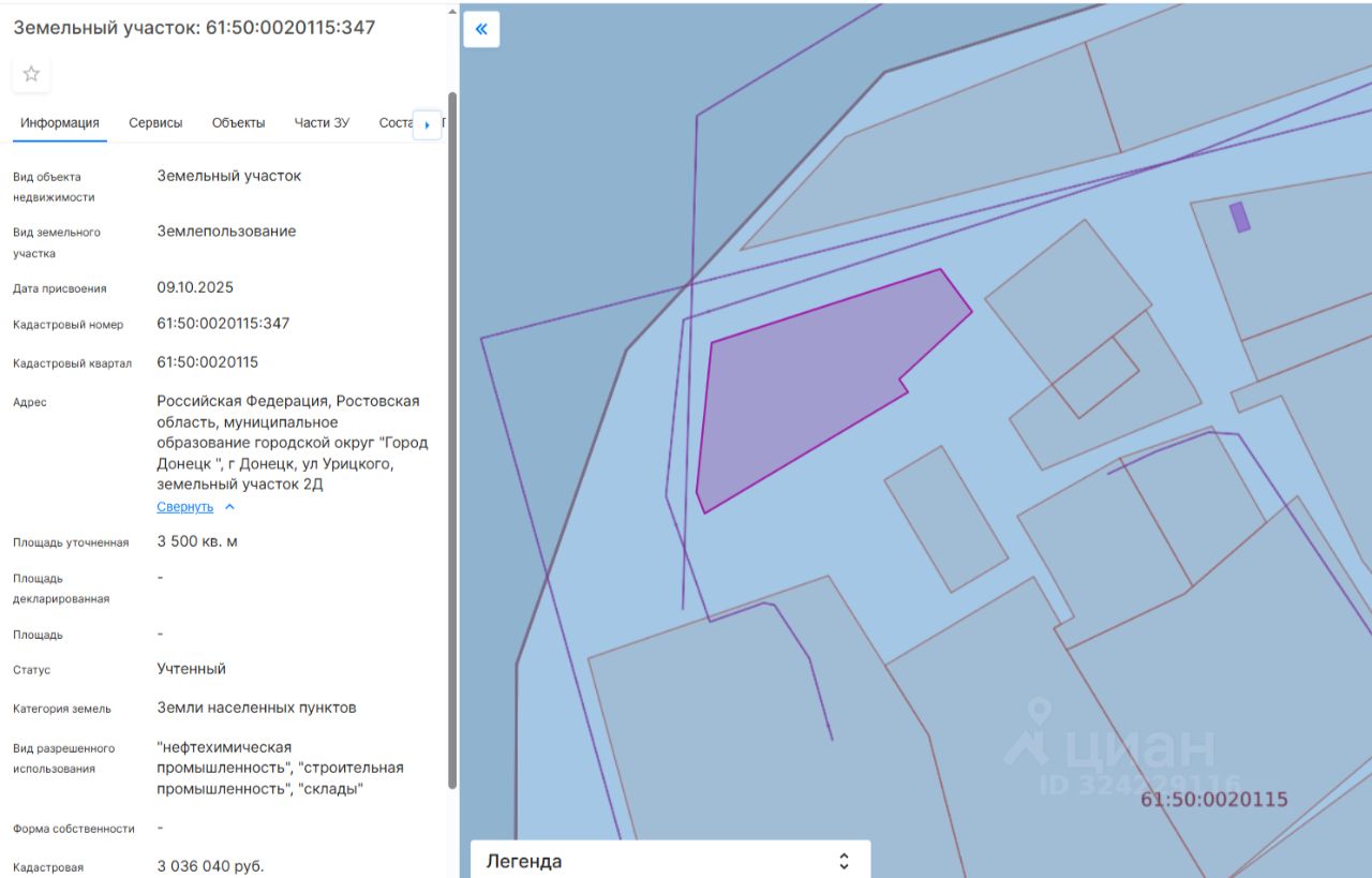 Земельный участок с кадастровым номером 61:50:0020115:347, общей площадью 3500,0 кв.м. с местоположением: Российская Федерация, Ростовская область, муниципальное образование городской округ "Город Донецк", город Донецк, улица Урицкого, земельный участок 2Д, вид разрешенного использования: "нефтехимическая промышленность", "строительная промышленность", "склады".