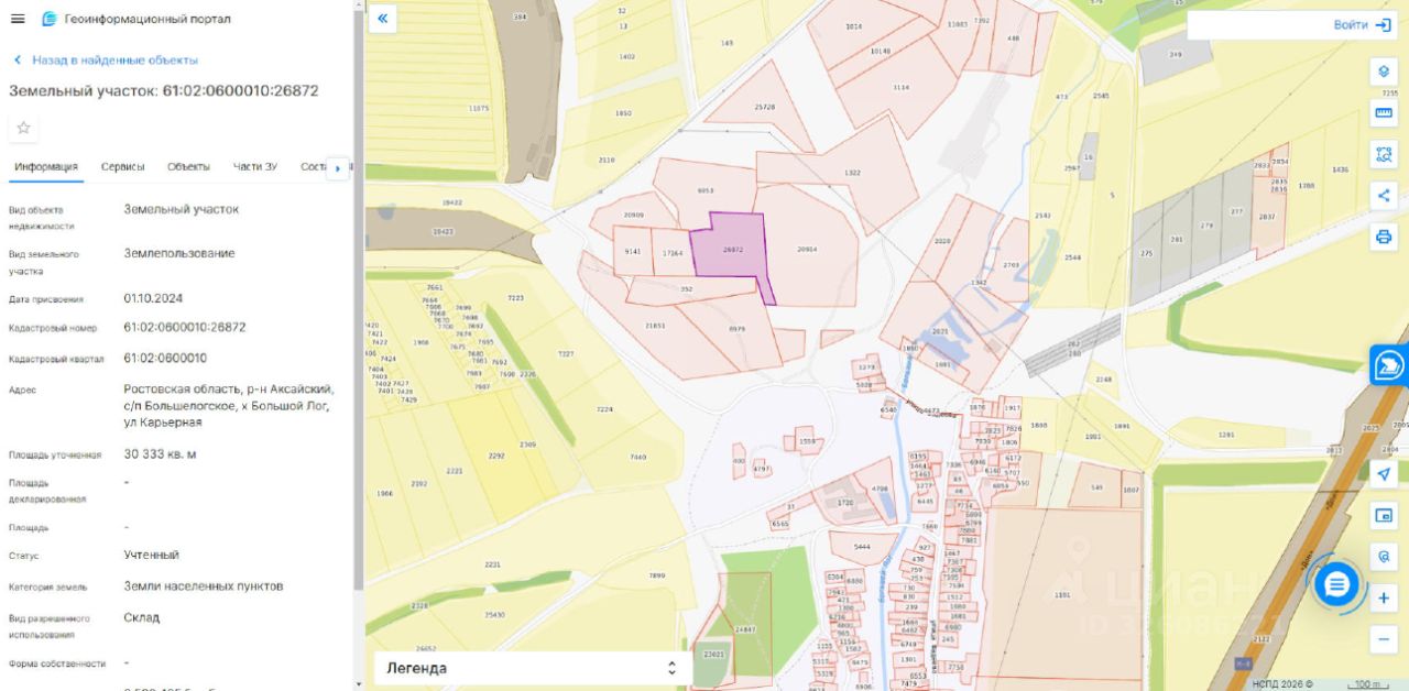 Земельный участок, государственная собственность на который не разграничена, из земель населенных пунктов, с кадастровым номером 61:02:0600010:26872, расположенный по адресу: Ростовская область, р-н Аксайский, с/п Большелогское, х. Большой Лог, ул. Карьерная, общей площадью 30333 кв.м.