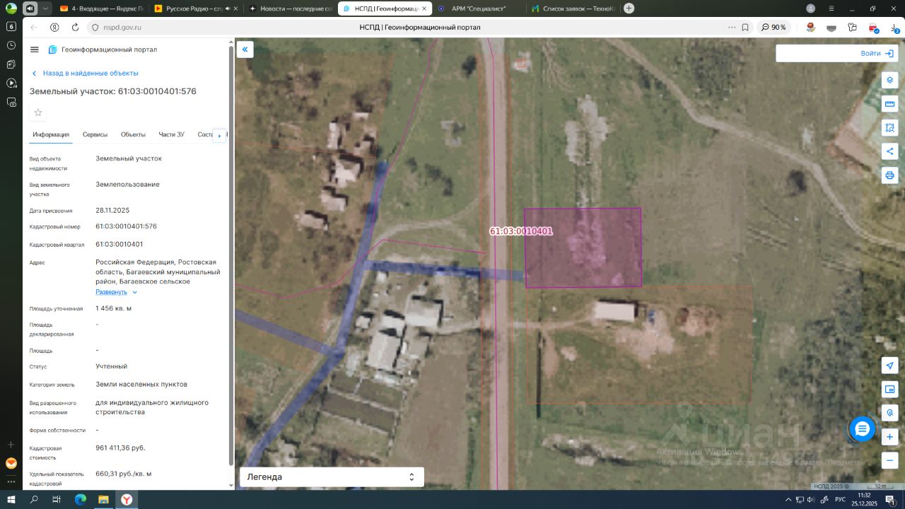 Земельный участок с кадастровым номером 61:03:0010401:576 площадь 1456 по адресу Российская Федерация, Ростовская область, Багаевский муниципальный район, Багаевское сельское поселение, х. Краснодонский