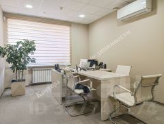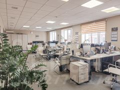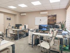 Офисное пространство полностью оснащено современной мебелью в классических светлых тонах, создавая комфортную и продуктивную атмосферу.