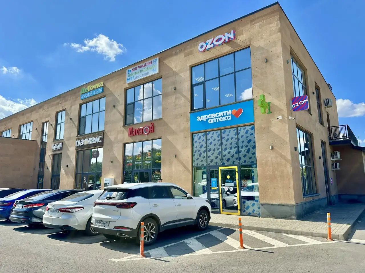 На 1-этаже ТЦ работают супермаркет Пятёрочка, Аптека Будь Здоров, Пивной магазин Газ-Квас, Пункт выдачи Ozon, Табачный магазин, Шашлычная-Мясной цех.