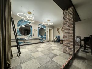 — зона ресепшен, зеркала, освещение уже установлены, также зона ожидания