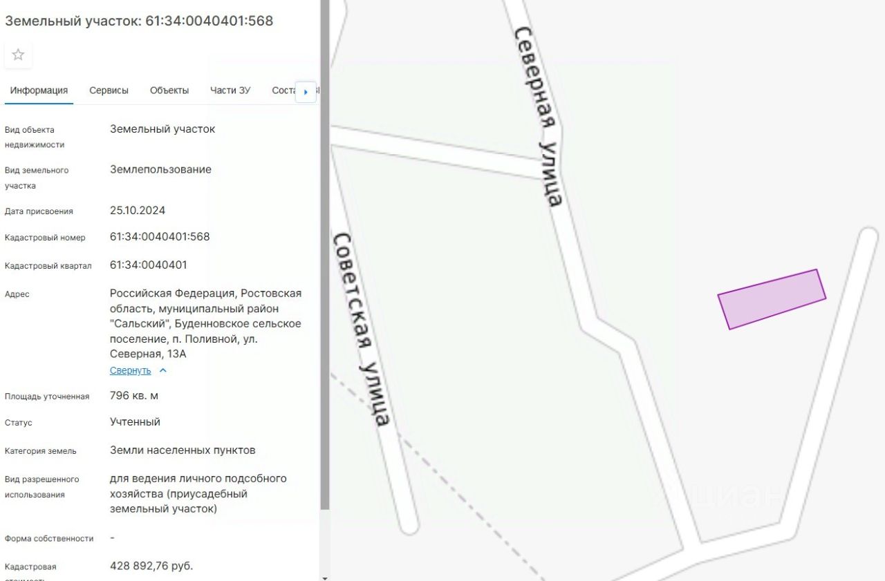 61:34:0040401:568, адрес: Российская Федерация, Ростовская область, муниципальный район "Сальский", Буденновское сельское поселение, п. Поливной, ул. Северная, 13А.