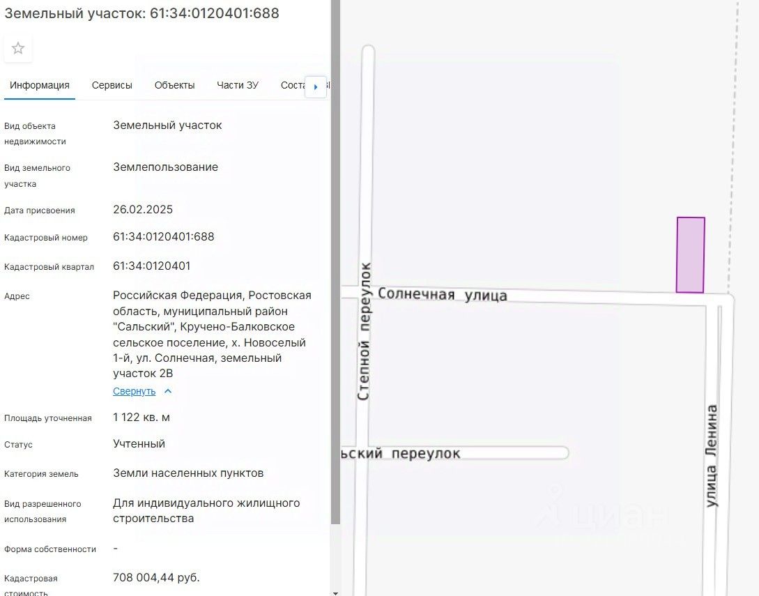 61:34:0120401:688, адрес: Российская Федерация, Ростовская область, муниципальный район "Сальский", Кручено-Балковское сельское поселение, х. Новоселый 1-й, ул. Солнечная, земельный участок 2В.