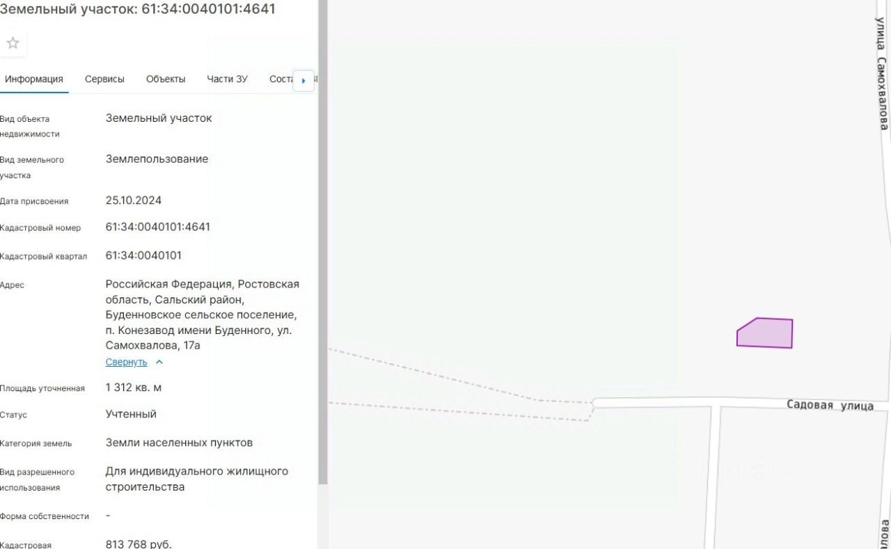 61:34:0040101:4641, адрес: Российская Федерация, Ростовская область, Сальский район, Буденновское сельское поселение, п. Конезавод имени Буденного, ул. Самохвалова, 17а.
