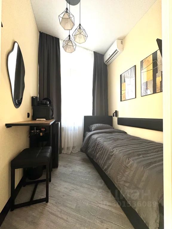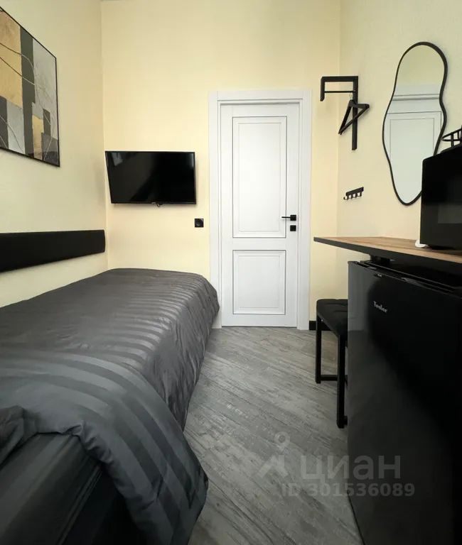 Односпальная кровать с ортопедическим матрасом, телевизор, сплит-система, столешница со стулом, система проводной и беспроводной зарядки гаджетов, холодильник, микроволновая печь, чайник, набор посуды, зеркало и вешалка для верхней одежды.