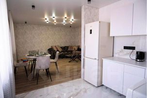 — Большая гостиная с раскладывающимся диваном, есть свой смарт телевизор, совмещенный санузел с ванной, кухня.