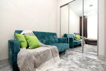 — раскладывающийся диван, гардеробная, совмещенный санузел с душем, кухня, балкон.