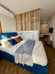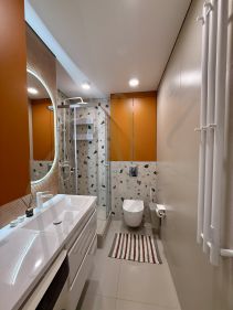В аренду сдается яркая и уютная квартира в новом доме с дизайнерским ремонтом! Комфортное место для сна с качественным матрасом, просторная гардеробная и много мест для хранения. Есть индукционная плита, посудомоечная машина, кофемашина, стирально-сушильная машина, быстрый интернет, набор посуды и приборов, система защиты от протечки, проточный водонагреватель, кондиционер в каждой комнате и разные сценарии освещения.