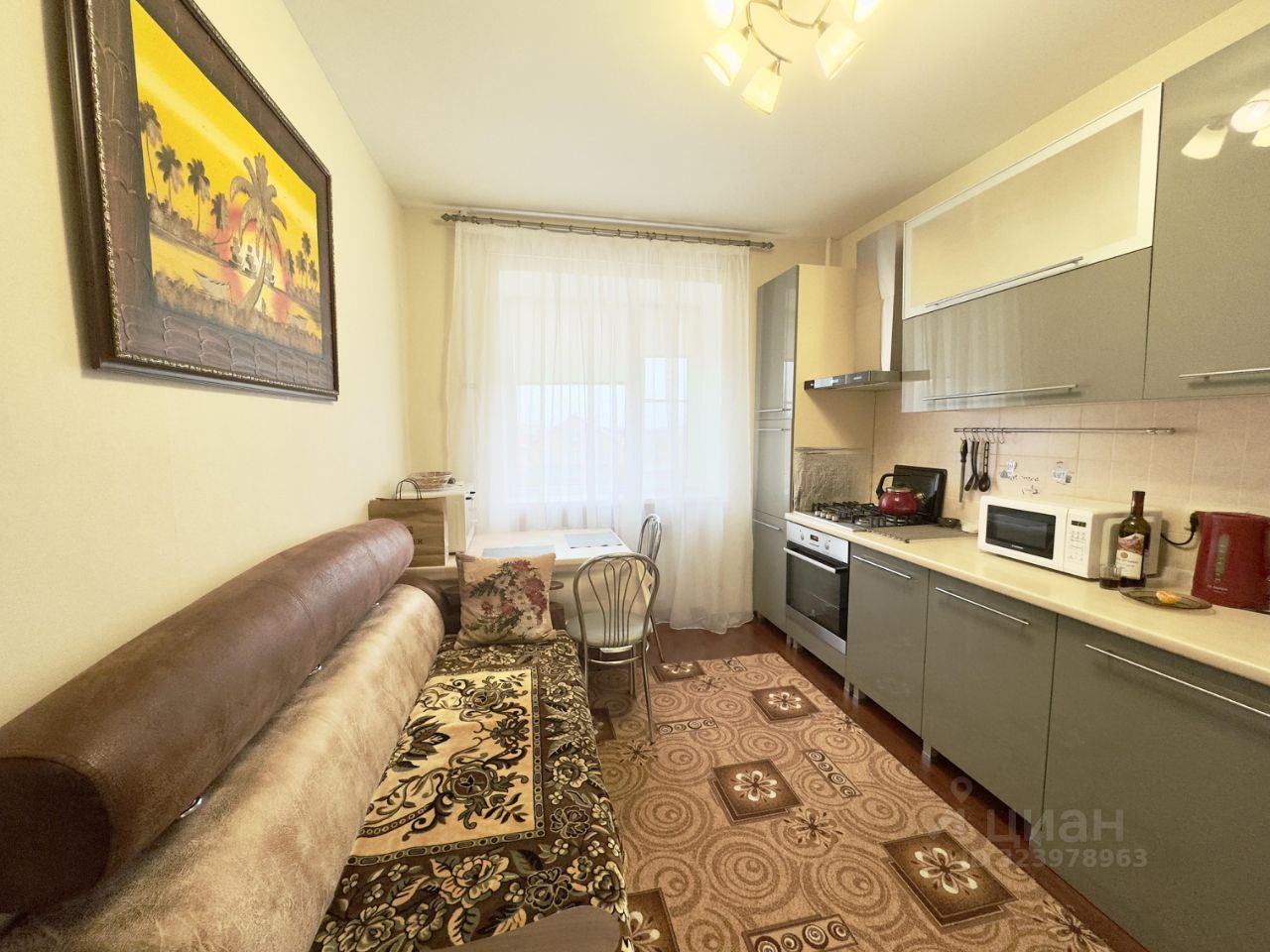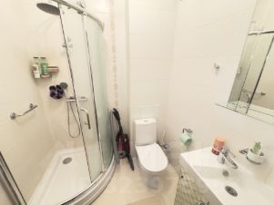 В квартире выполнен косметический ремонт, есть необходимая мебель и техника: холодильник, телевизор и стиральная машина. Кухня просторная, площадью 10 кв. м, с удобной обстановкой. В совмещенном санузле установлена душевая кабина.