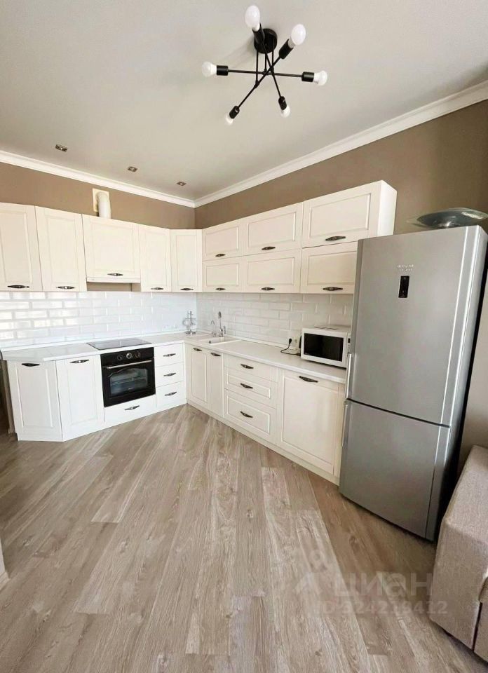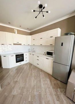 Кухня порадует вас современным угловым гарнитуром, укомплектованным всей необходимой техникой: двухкамерным холодильником, микроволновой печью и удобной обеденной зоной.