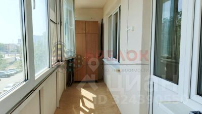 Большая и светлая застекленная лоджия с ковролином на полу и вместительным шкафом.