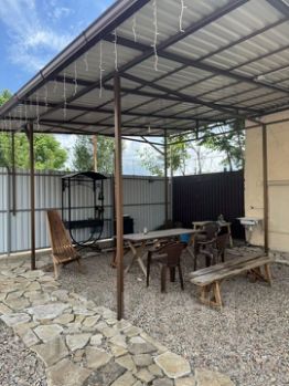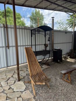 На территории участка обустроена зона отдыха с мангалом и шезлонгами под навесом. Также имеется летний душ.