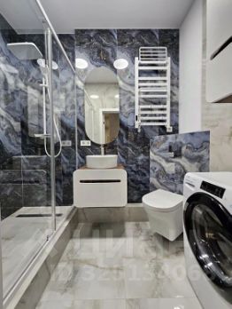 Просторный совмещенный санузел оборудован современной сантехникой и стиральной машиной.