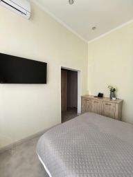 В номере одна двуспальная кровать. Функциональное наполнение номера: ТВ, Wi-Fi, кондиционер, чайник, комплект чашек и стаканов, чайный набор, бутилированная питьевая вода негазированная. Ванная комната: набор полотенец, халаты, тапочки, фен, основные туалетные принадлежности: гель, шампунь, зубной набор.