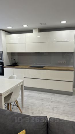 На кухне стильная подсветка по периметру верхних шкафов и индукционная варочная панель с духовкой.