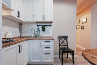 Кухня укомплектована всей необходимой техникой: холодильник, СВЧ, плита. Есть посуда для приготовления пищи и сервировки стола. Из кухни есть выход на застекленную лоджию с видом во двор.