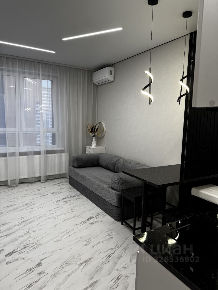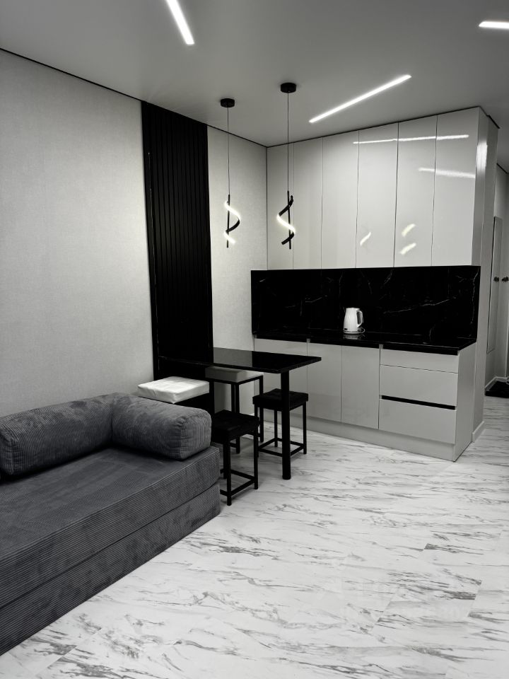 В квартире выполнен качественный евроремонт. Пространство студии продумано до мелочей: в комнате и на кухне есть необходимая мебель, а также вся необходимая техника — кондиционер, холодильник, телевизор и стиральная машина. Окна квартиры выходят во двор, что обеспечивает тишину и спокойствие. Ванная комната оборудована душевой кабиной, что делает утренние сборы быстрыми и комфортными.