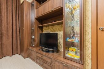 В комнате остается большой двуспальный диван, возле которого предусмотрены две розетки, телевизор с мебельной стенкой.