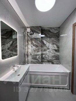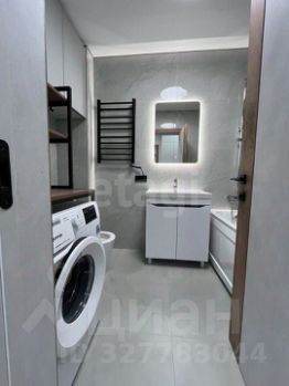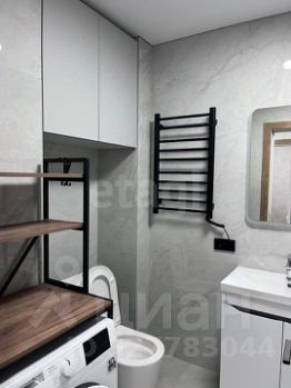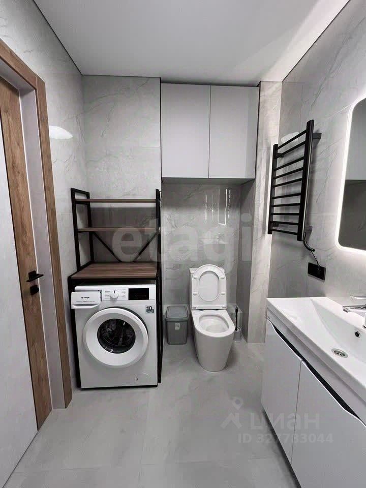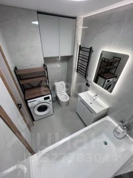 Ванная комната оборудованна стиральной машиной, полотенце-сушетелем, водонагревателем, зеркало с подвсветкой. Стены и пол облицованы крупноформатной плиткой.