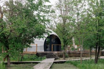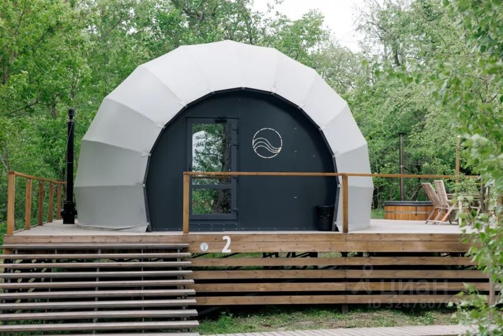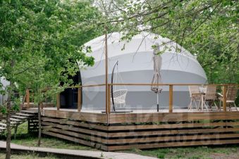 Купольный дом "Улитка" с купелью и панорамным видом на природу идеально подойдёт для пары или небольшой семьи. Уютный купол площадью 30 м2 с большой двуспальной кроватью и затемнёнными шторами создаёт атмосферу уединения и комфорта. Система отопления и кондиционирования включает в себя тёплый пол, сплит-систему и камин на пеллетах, который включается в зимний период.