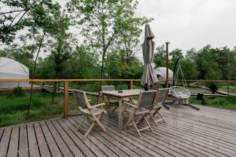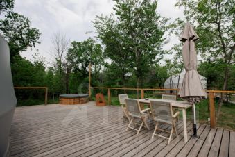 На террасе установлена мебель с зонтом и купель японской бани Фурако. Это место идеально подходит для романтических выходных вдвоём.
