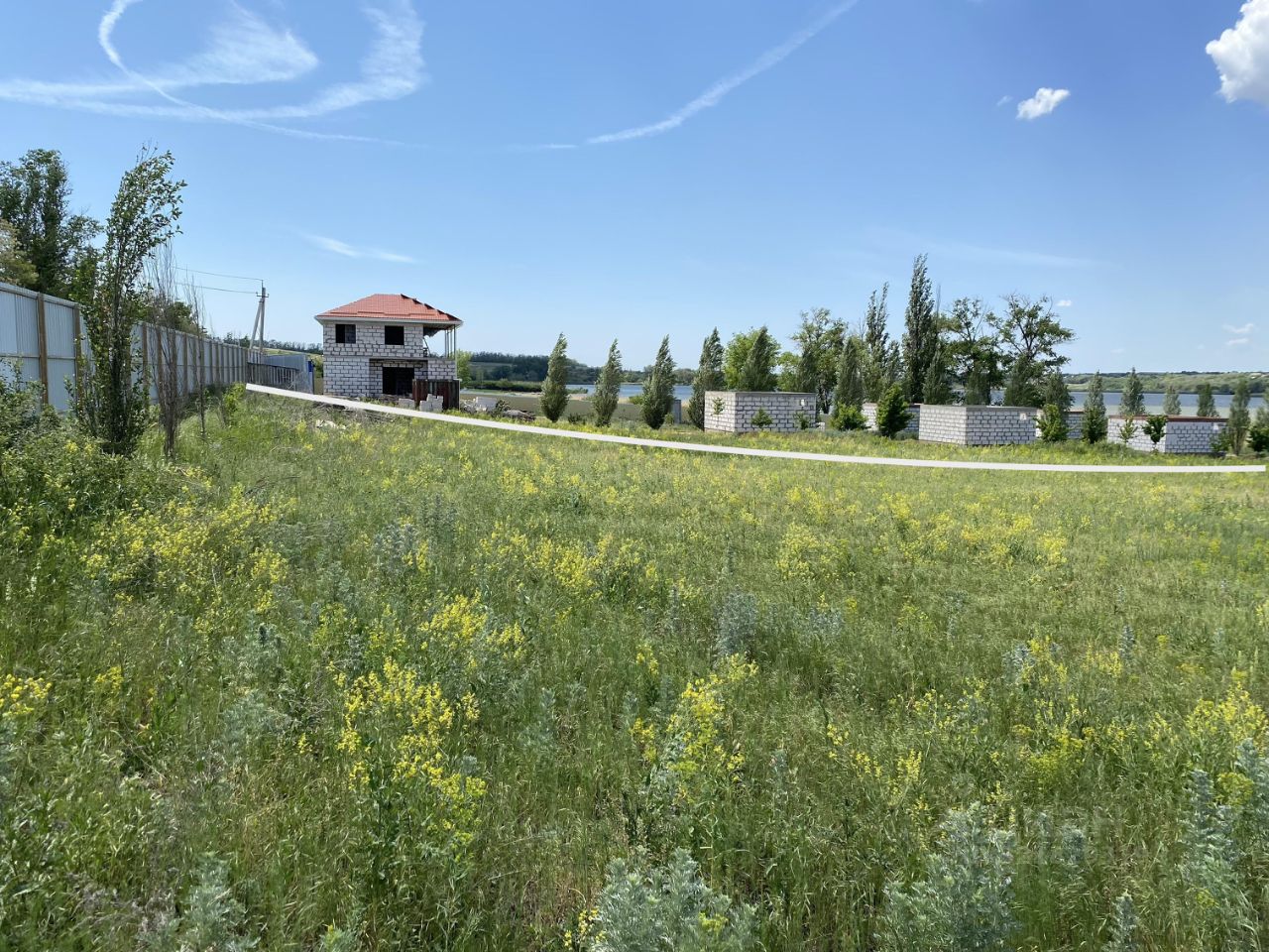 Участок ровный, прямоугольный с небольшим уклоном, чистый, высажены деревья. Рядом с участком проходит лэп (столб у забора), можно подключаться к сетям. Есть свой выход к воде, вход пологий, береговая линия требует расчистки, длина береговой линии около 90 метров. С двух сторон огрожен высоким металлическим забором.