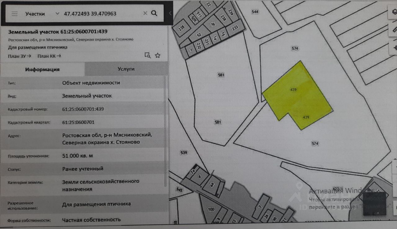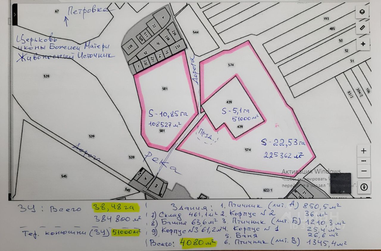 Продаётся КФХ. На берегу реки, земли сельхозназначения 38га. Адрес по ЕГРН: Ростовская область, Мясниковский район, северная окраина х. Стояново. На фото показана схема размещения участков. КФХ включает три земельных участка: ЗУ1 - 5га, на нём расположены два здания конюшни (птичник) 1210м2 и 1345м2, здание пром. назначения 850м2, склад 461м2, три сруба для проживания и баня. Территория огорожена, своя ТП, скважина, газ по меже. За конюшней вырыт пруд. Подъезные пути асфальт. Вокруг конюшни два поля ЗУ2 - 22.5га, ЗУ3 - 10,8га.