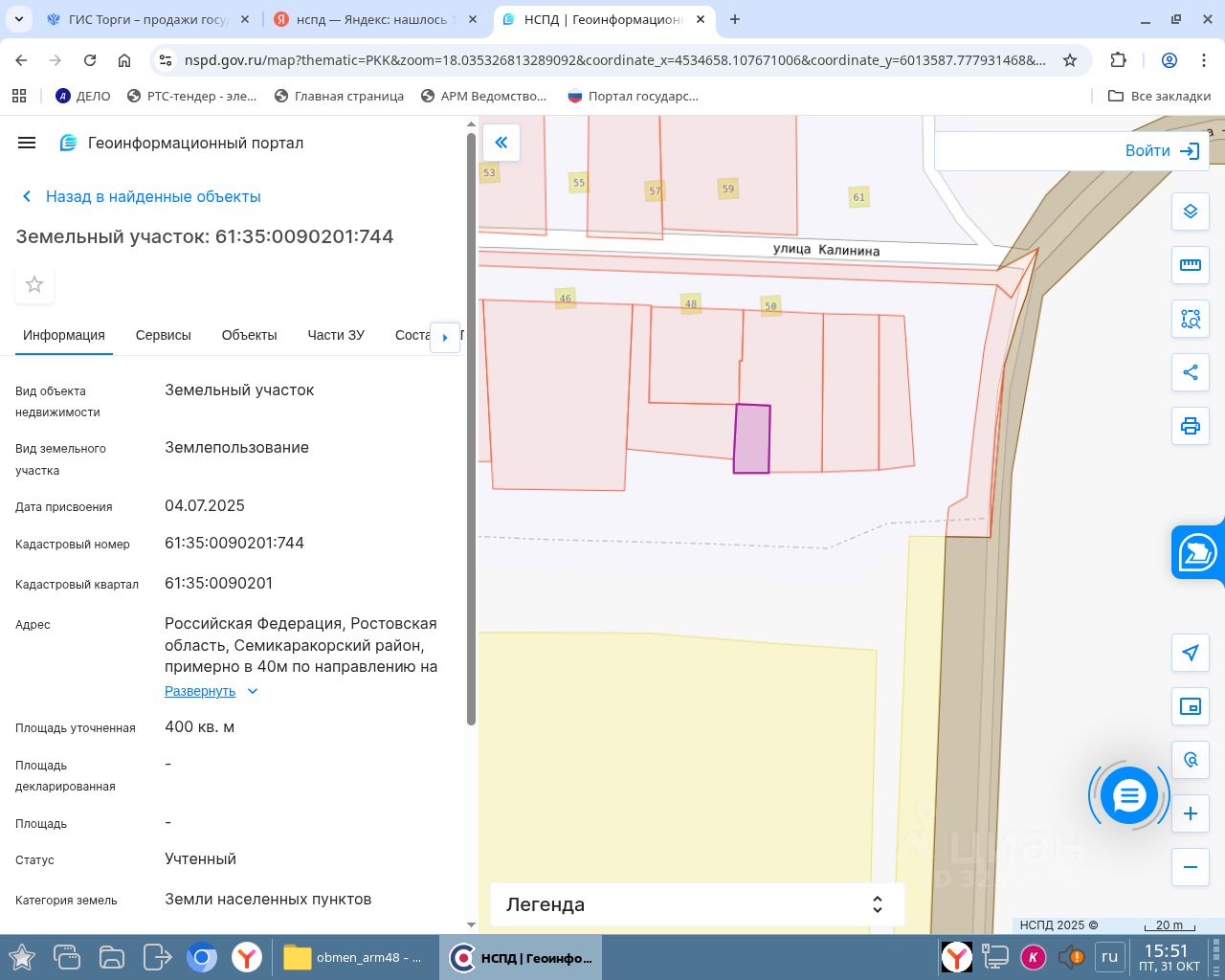 Земельный участок с кадастровым номером 61:35:0090201:744 площадь 400 по адресу Российская Федерация, Ростовская область, Семикаракорский район, примерно в 40м по направлению на юг от строения, расположенного по адресу: х. Костылевка, ул. Калинина, 50