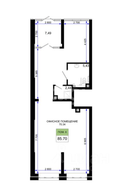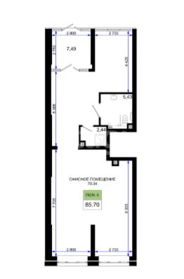 Помещение расположено на первом этаже, срок сдачи дома IV кв. 2026. Общая площадь 85.7м2. Помещение подходит для размещения офиса