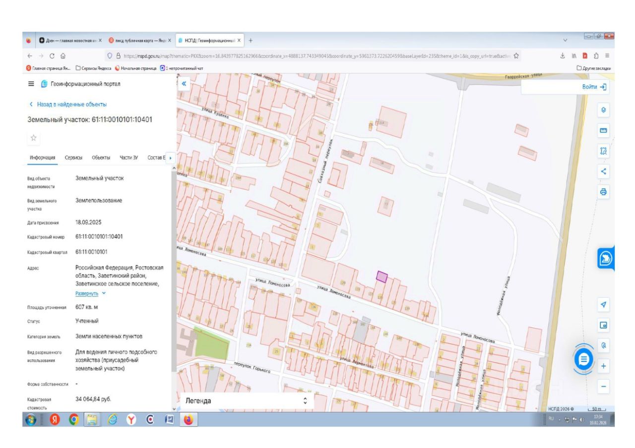 Земельный участок кадастровый номер 61:11:0010101:10401, площадь 607 +/- 9 кв. метров, категория земель: земли населенных пунктов, вид разрешенного использования для ведения личного подсобного хозяйства (приусадебный земельный участок), адрес (местоположение): Российская Федерация, Ростовская область, Заветинский район, Заветинское сельское поселение, село Заветное, улица Ломоносова, 135а, кадастровой стоимостью 34 064,84 рублей.