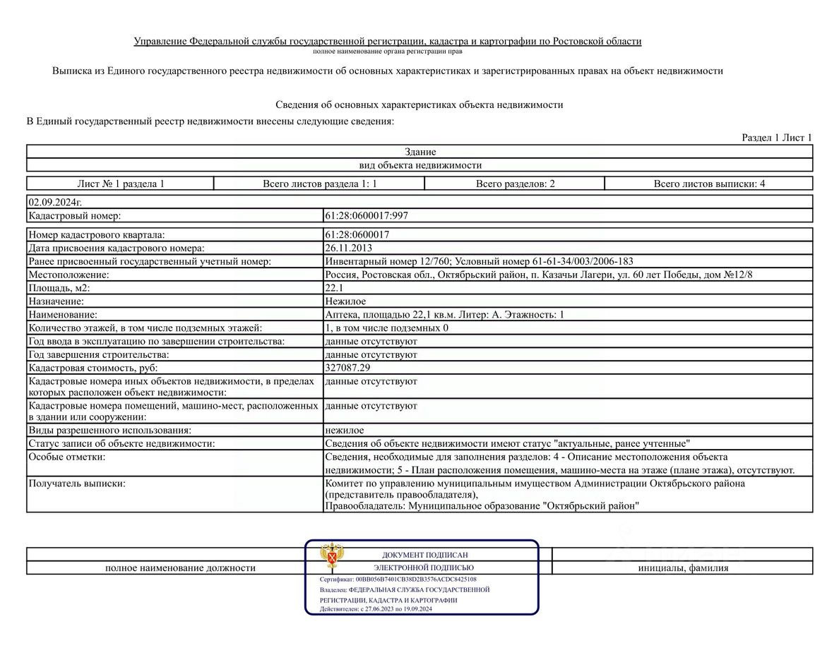 Здание с кадастровым номером 61:28:0600017:997 площадь 22.1 по адресу Россия, Ростовская обл., Октябрьский район, п. Казачьи Лагери, ул. 60 лет Победы, дом 12/8