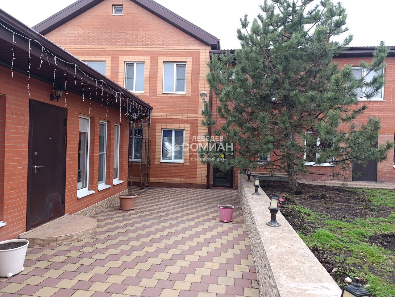 Двор полность благоустроен: выложен плиткой, посажены розовые кусты, хвойные деревья.