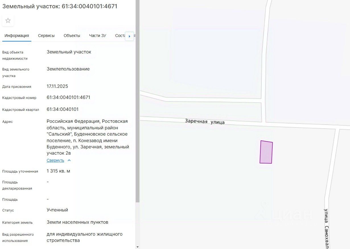 Российская Федерация, Ростовская область, муниципальный район "Сальский", Буденновское сельское поселение, п. Конезавод имени Буденного, ул. Заречная, земельный участок 2в
