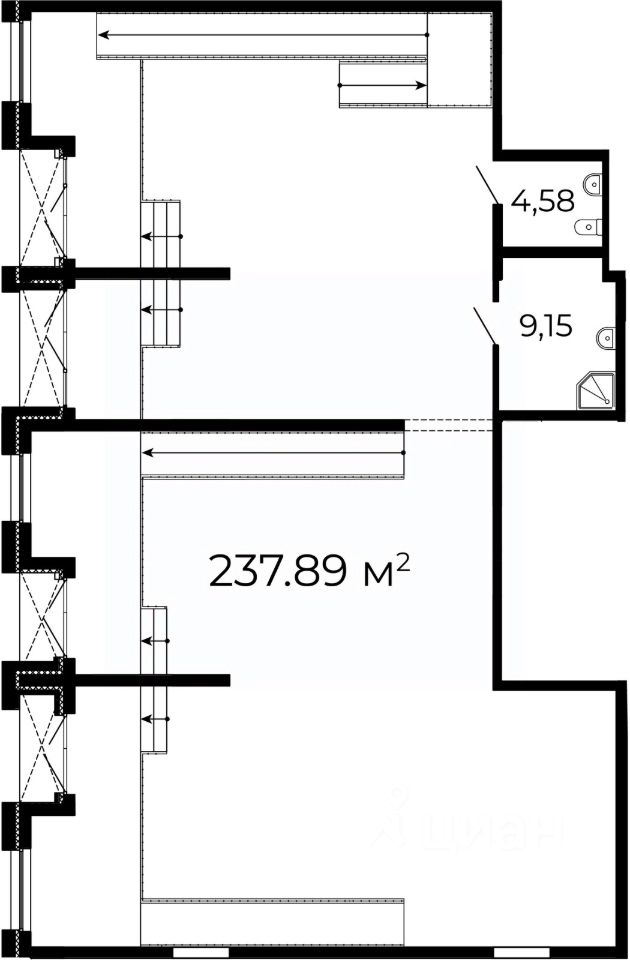 Помещение свободного назначения на -1 этаже, общая площадь 237.89 кв.м.