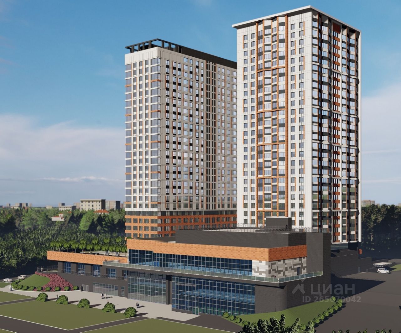 Многоквартирный жилой дом со встроенными помещениями коммерческого назначения и двухуровневой подземной автостоянкой состоит из двух отдельно стоящих 28-29 этажных зданий. Силуэтная композиция двух домов разнесена по периметру трехуровневого стилобата.