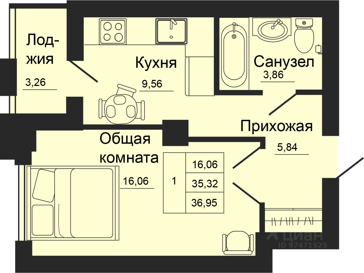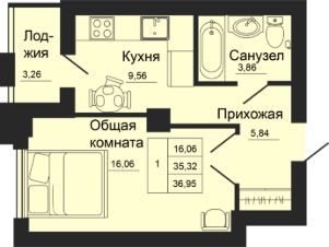 Общая площадь36,95 м²