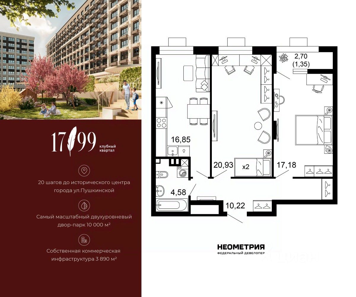 Продается квартира в клубном квартале "1799". Это истинный бизнес-класс в историческом центре Ростова. Особое сочетание уникальной локации и среды, где хочется создавать ту жизнь, которая подходит вам. Где каждое мгновение становится частью семейной коллекции лучших моментов. Квартал вдохновлен идеями великих и создан для великих. Образ хранителя ценностей — в каждой детали: имя и философия замедления, аристократичные фасады, лобби и холлы, семейные резиденции-истории и актуальное содержание. На приватной территории в 2,5 гектара четыре дома всего 10-этажей образуют масштабный двухуровневый двор-парк 10 000 м2 со smart-зонированием по возрастам и интересам. Среда квартала продумана для всей семьи: учебы и работы, спорта и отдыха, совместного досуга и теплых бесед. Гамак мечтателя, тайные места и маршруты, вертикальный сад пряных трав, амфитеатр и даже новогодняя ель. Резидентам доступны редкие для центра привилегии — природная тишина и свобода быть собой. Безукоризненный сервис и собственная коммерческая инфраструктура 3 890 м2, где все необходимое под рукой, позволяют жить в центре с бескомпромиссным комфортом.