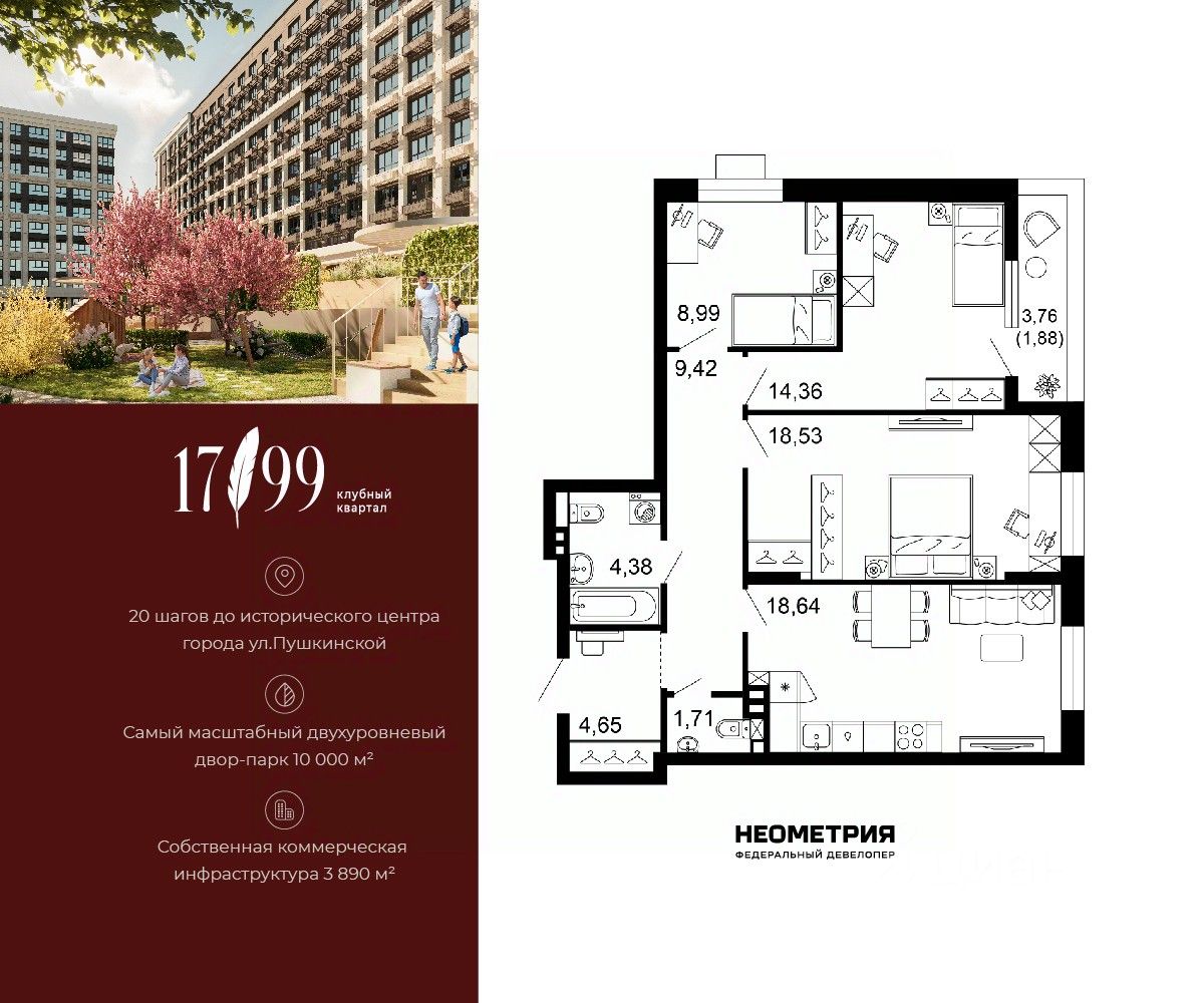 Продается квартира в клубном квартале "1799". Это истинный бизнес-класс в историческом центре Ростова. Особое сочетание уникальной локации и среды, где хочется создавать ту жизнь, которая подходит вам. Где каждое мгновение становится частью семейной коллекции лучших моментов. Квартал вдохновлен идеями великих и создан для великих. Образ хранителя ценностей — в каждой детали: имя и философия замедления, аристократичные фасады, лобби и холлы, семейные резиденции-истории и актуальное содержание. На приватной территории в 2,5 гектара четыре дома всего 10-этажей образуют масштабный двухуровневый двор-парк 10 000 м2 со smart-зонированием по возрастам и интересам. Среда квартала продумана для всей семьи: учебы и работы, спорта и отдыха, совместного досуга и теплых бесед. Гамак мечтателя, тайные места и маршруты, вертикальный сад пряных трав, амфитеатр и даже новогодняя ель. Резидентам доступны редкие для центра привилегии — природная тишина и свобода быть собой. Безукоризненный сервис и собственная коммерческая инфраструктура 3 890 м2, где все необходимое под рукой, позволяют жить в центре с бескомпромиссным комфортом.