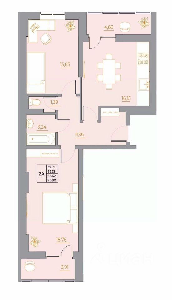 •2 изолированные спальни: 13 и 18 кв.м (с выходом на лоджию)