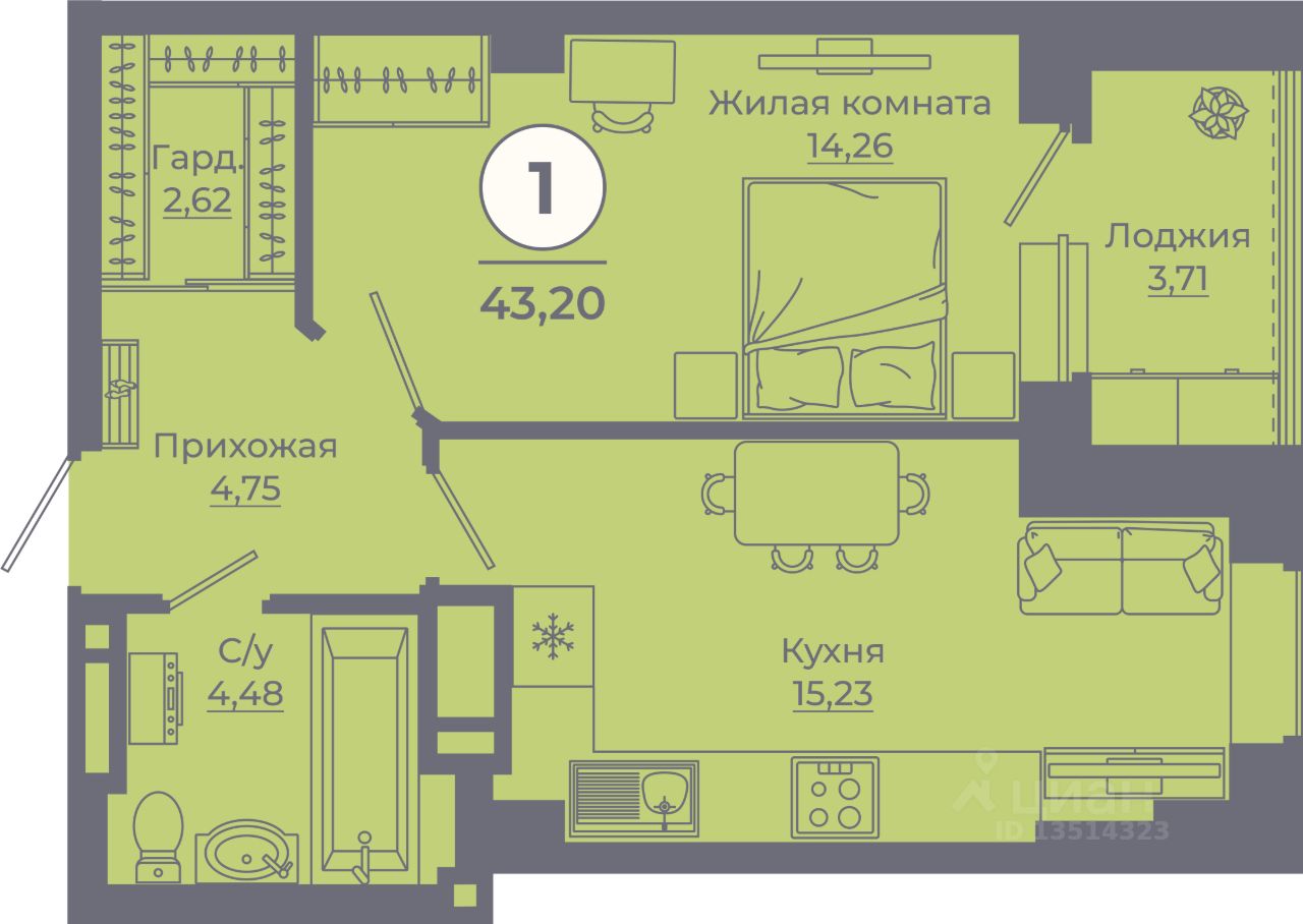Жилая площадь14,3 м²