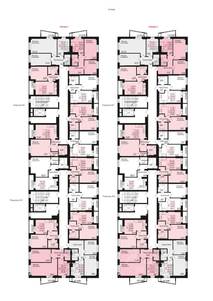 • Всего 57 квартир на этаже