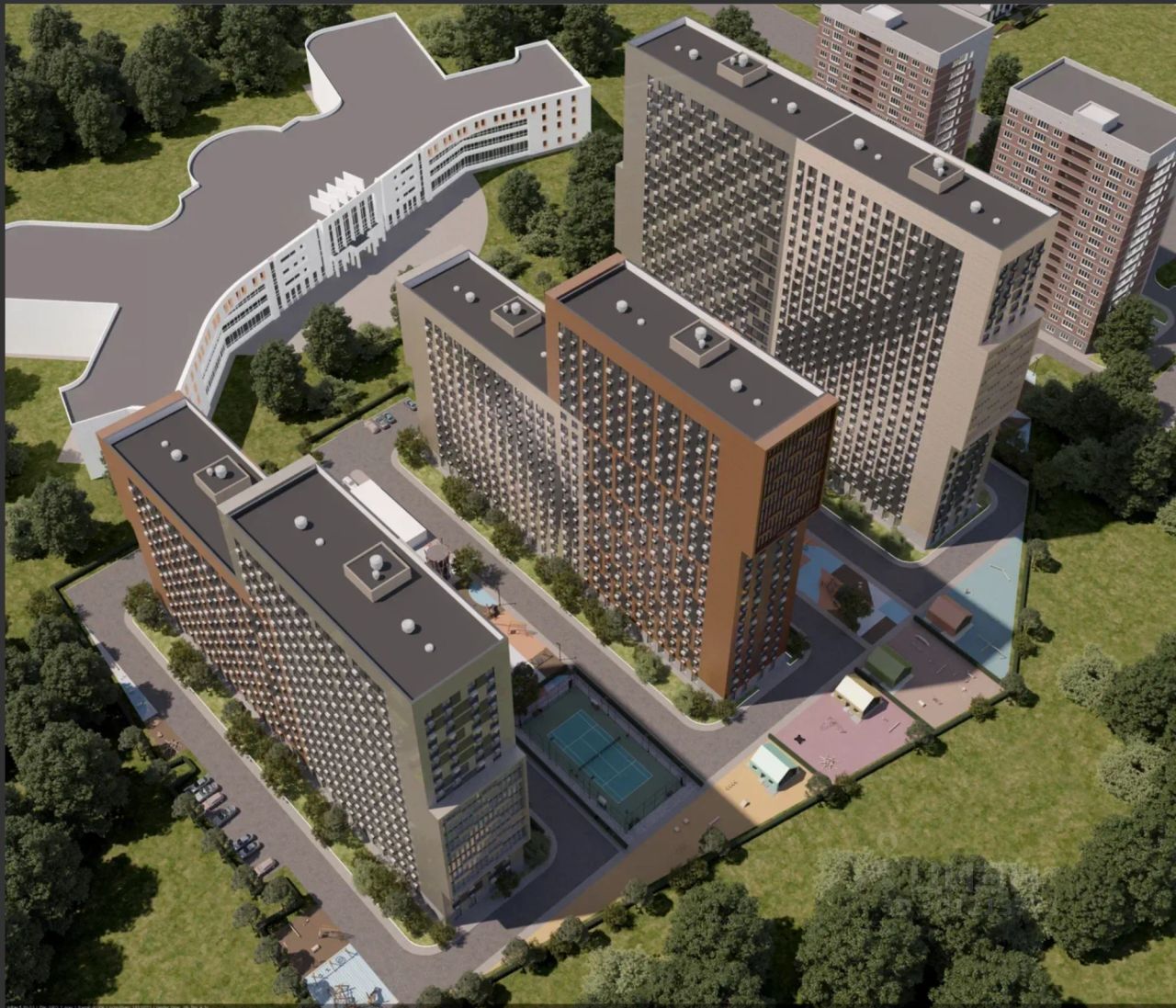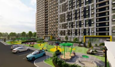 Собственный двор с детскими игровыми зонами, спортплощадками и зелеными зонами для прогулок.