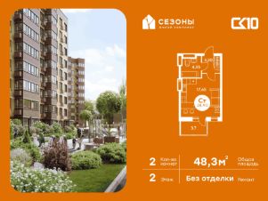 Продаётся 2-комнатная квартира в строящемся доме (Дом 1), срок сдачи: IV-кв. 2026, общей площадью 48.3 кв.м., на 2 этаже. ЖК Сезоны 1 это уникальный проект, созданный вдалеке от шума и суеты мегаполиса. Радоваться каждому дню в любом возрасте здесь будет проще - внутреннее состояние удовольствия поддерживает окружающая обстановка.