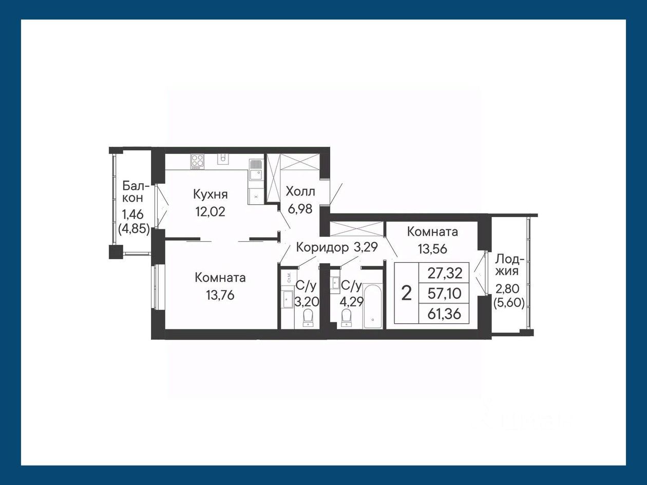 В этой двухкомнатной квартире есть мастер-спальня с лоджией и кухня с балконом.