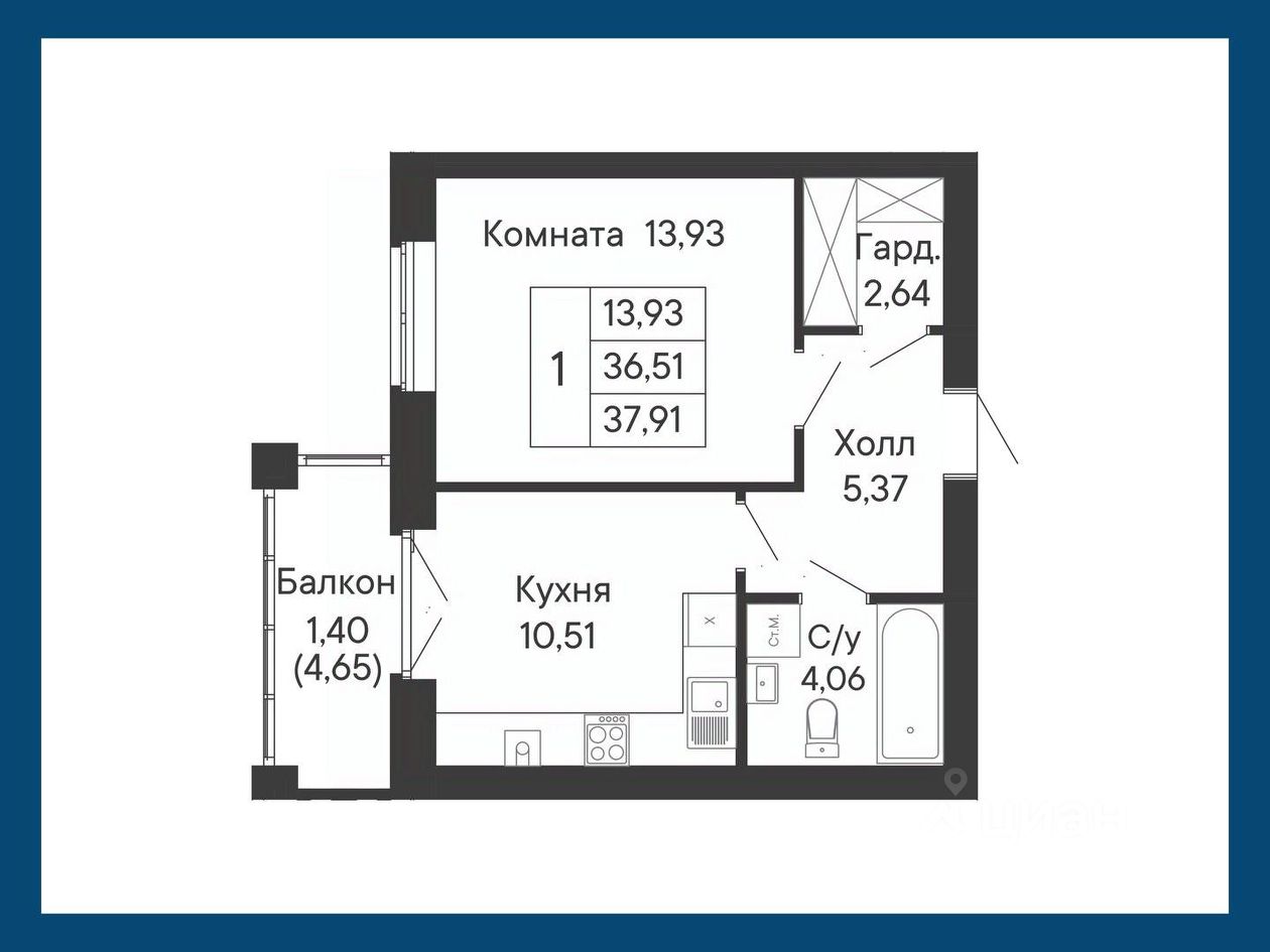 Данный вариант — удобное планировочное решение однокомнатной квартиры с балконом на кухне и гардеробом в холле.