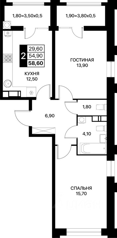 Общая площадь58,6 м²